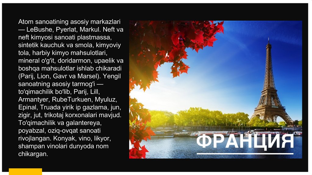 Yaponiya bilan hamkorlik qiladi. Fransiyada xalqaro turizm rivojlangan:-yiliga 50 mln. kishi kelibketadi.