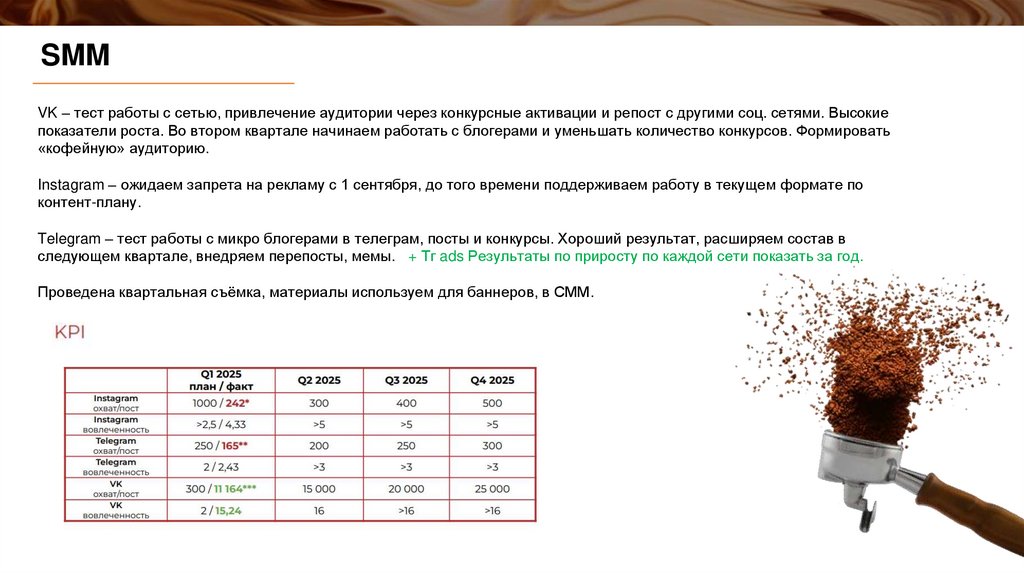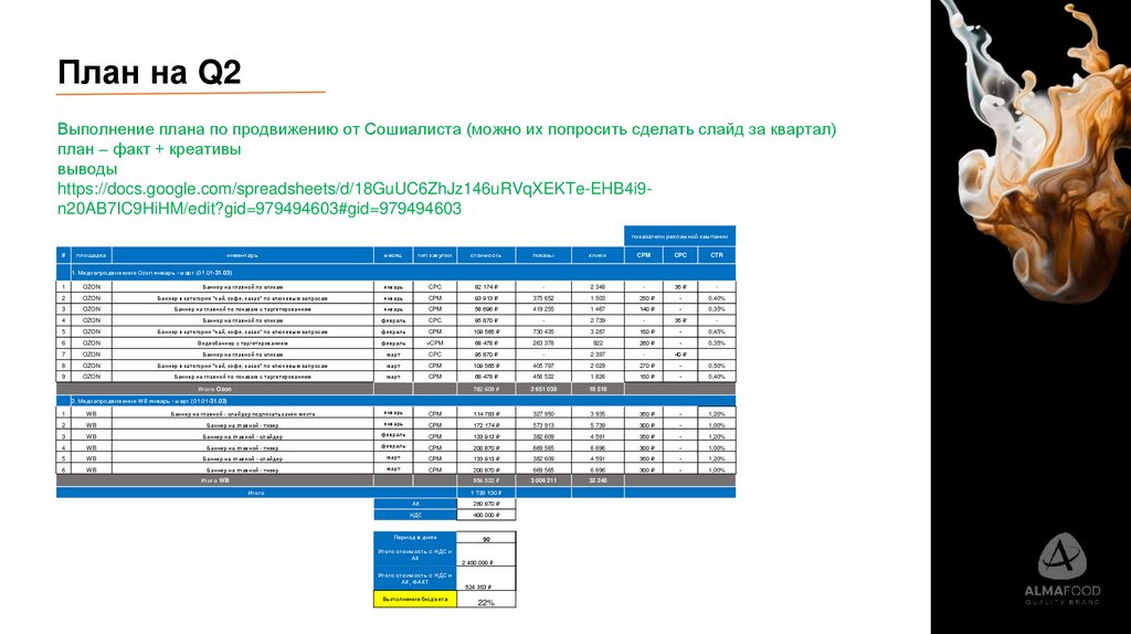 План на Q2Выполнение плана по продвижению от Сошиалиста (можно их попросить сделать слайд за квартал)