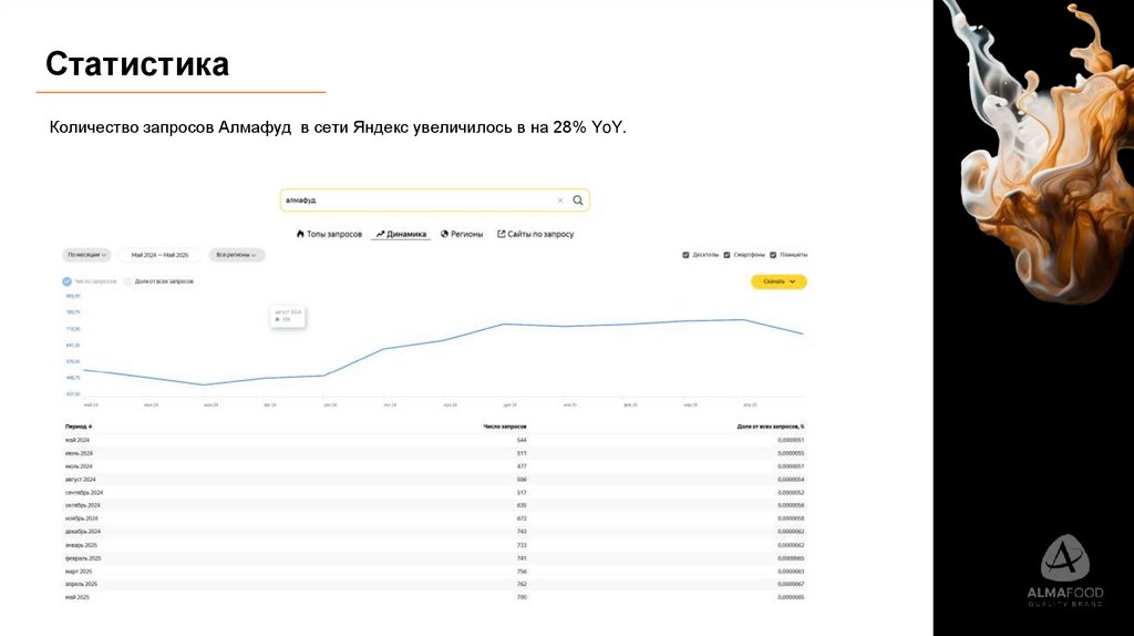 СтатистикаКоличество запросов Алмафуд в сети Яндекс увеличилось в на 28% YoY.