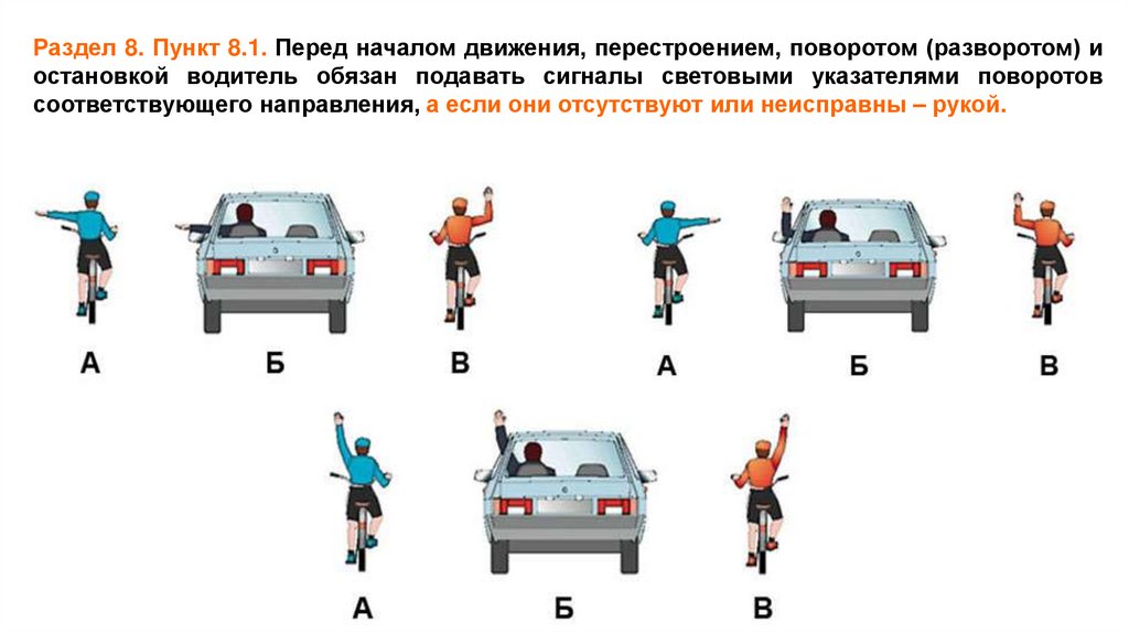 Раздел 8. Пункт 8.1. Перед началом движения, перестроением, поворотом (разворотом) иостановкой водитель обязан подавать сигналы световыми указателями поворотов