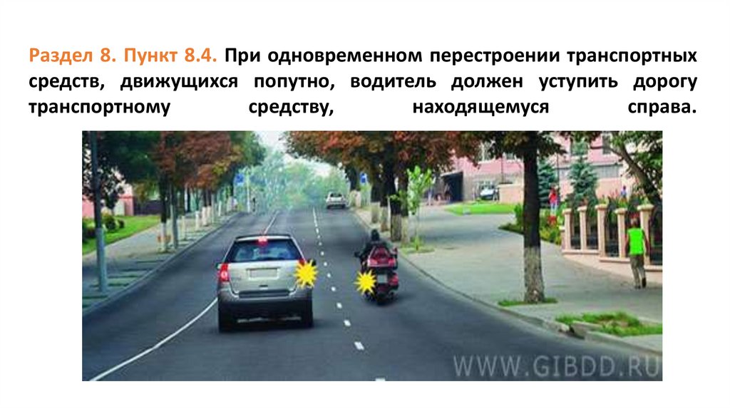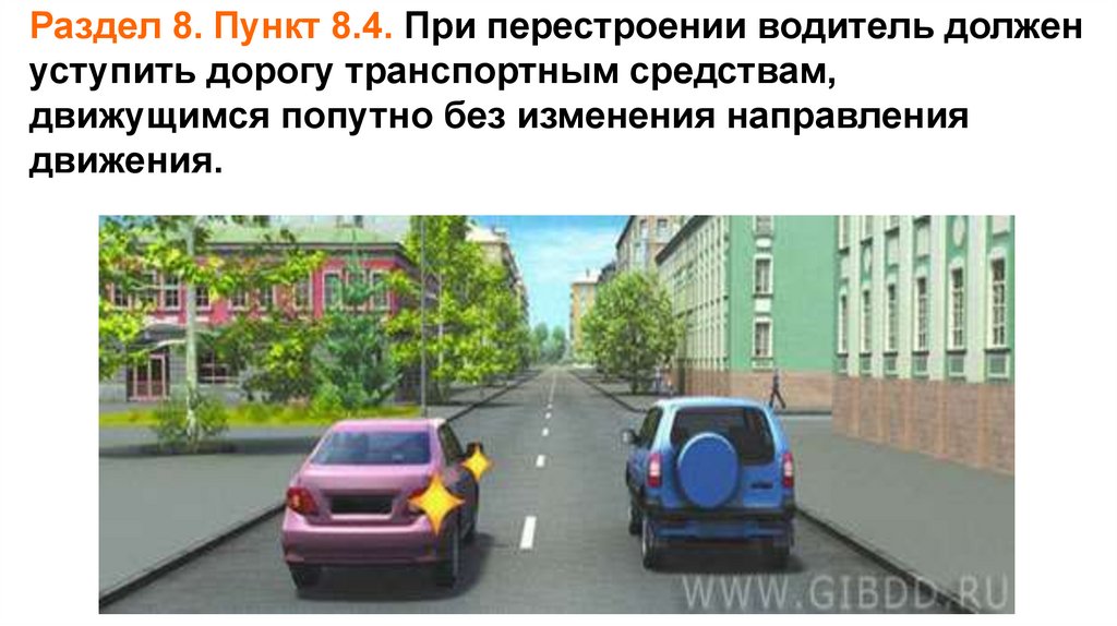 Раздел 8. Пункт 8.4. При одновременном перестроении транспортныхсредств, движущихся попутно, водитель должен уступить дорогу