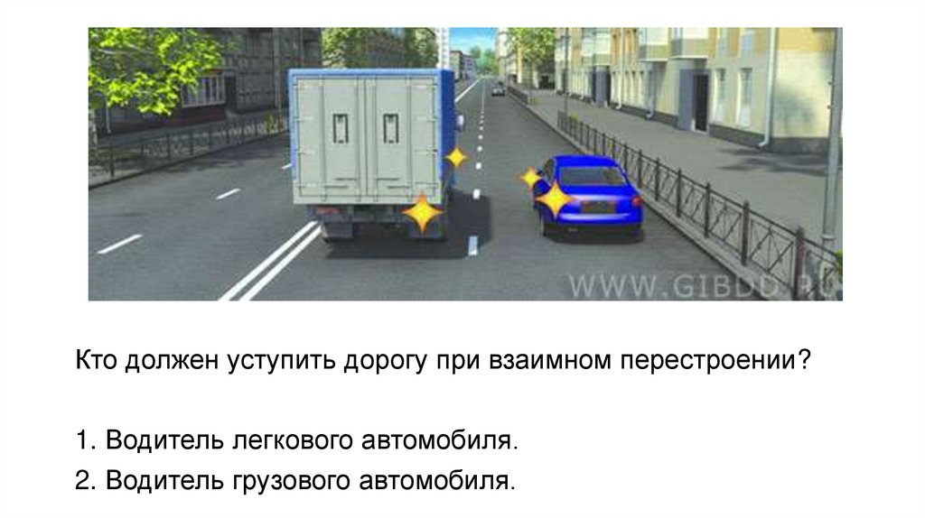 Кто должен уступить дорогу при взаимном перестроении?1. Водитель легкового автомобиля.