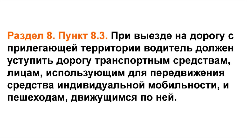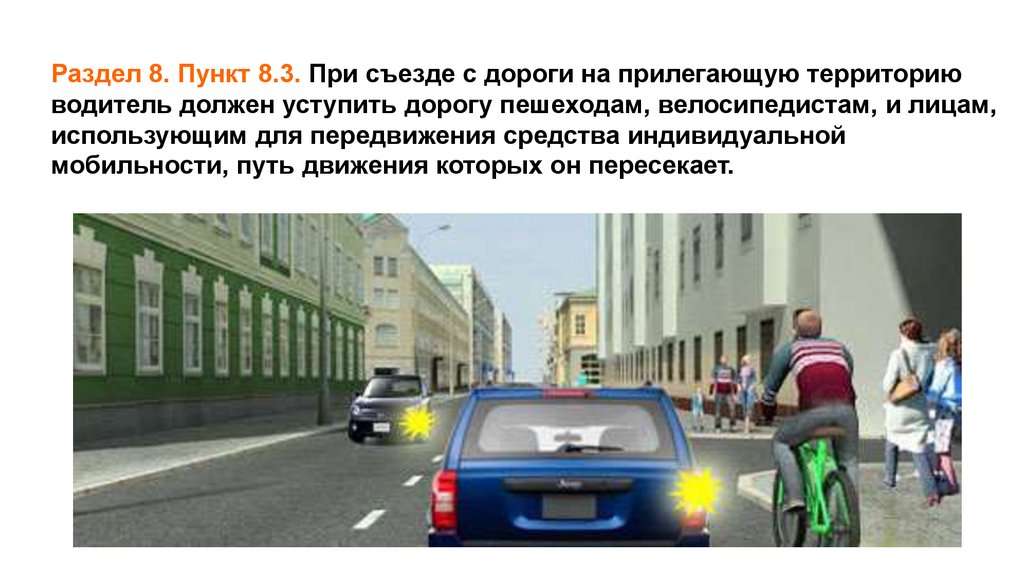 Раздел 8. Пункт 8.3. При съезде с дороги на прилегающую территориюводитель должен уступить дорогу пешеходам, велосипедистам, и лицам,