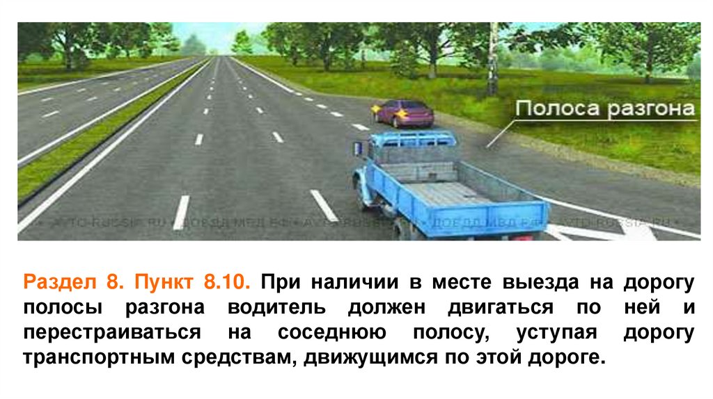 Раздел 8. Пункт 8.10. При наличии в месте выезда на дорогуполосы разгона водитель должен двигаться по ней и
