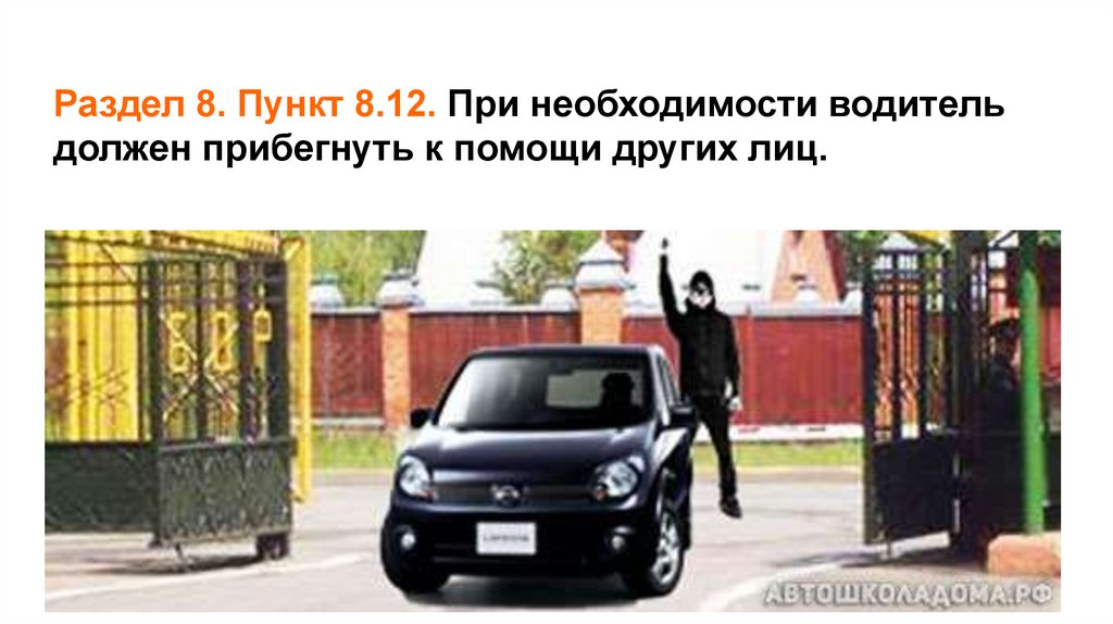Раздел 8. Пункт 8.12. При необходимости водительдолжен прибегнуть к помощи других лиц.