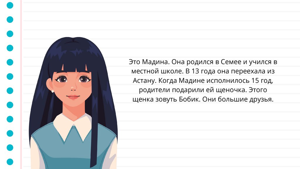Это Мадина. Она родился в Семее и учился вместной школе. В 13 года она переехала из