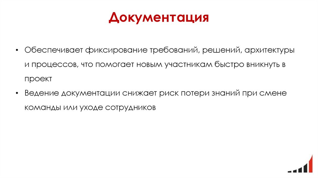 Документация• Обеспечивает фиксирование требований, решений, архитектуры