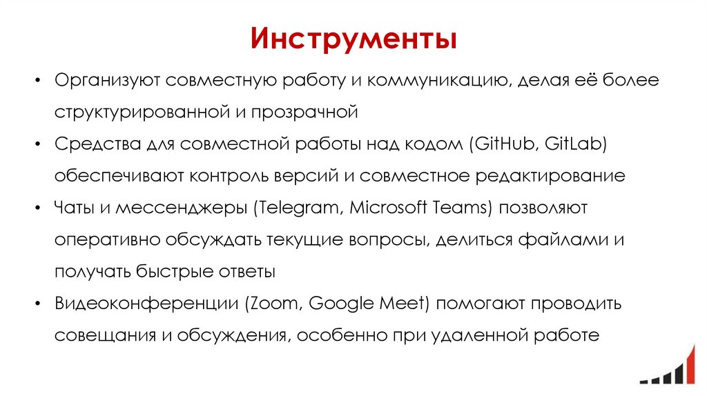 Инструменты• Организуют совместную работу и коммуникацию, делая её более