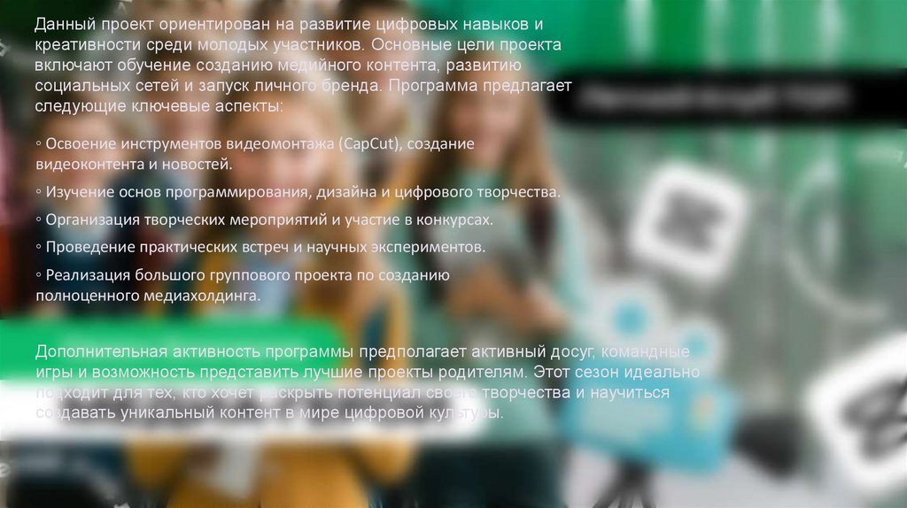 Данный проект ориентирован на развитие цифровых навыков икреативности среди молодых участников. Основные цели проекта