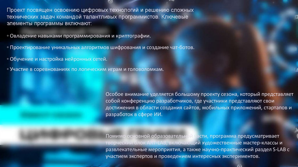 Проект посвящен освоению цифровых технологий и решению сложныхтехнических задач командой талантливых программистов. Ключевые