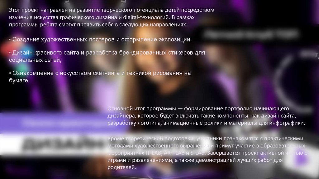 Этот проект направлен на развитие творческого потенциала детей посредствомизучения искусства графического дизайна и digital-технологий. В рамках
