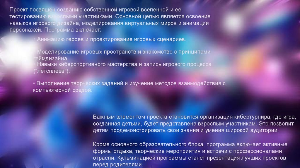 Проект посвящен созданию собственной игровой вселенной и еётестированию взрослыми участниками. Основной целью является освоение
