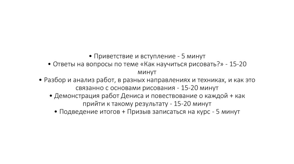 1. • Приветствие и вступление - 5 минут • Ответы на вопросы по теме «Как научиться рисовать?» - 15-20 минут • Разбор и анализ