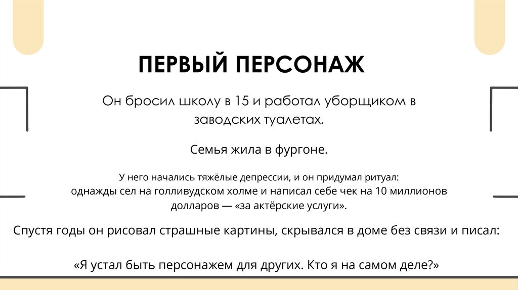 ПЕРВЫЙ ПЕРСОНАЖОн бросил школу в 15 и работал уборщиком в