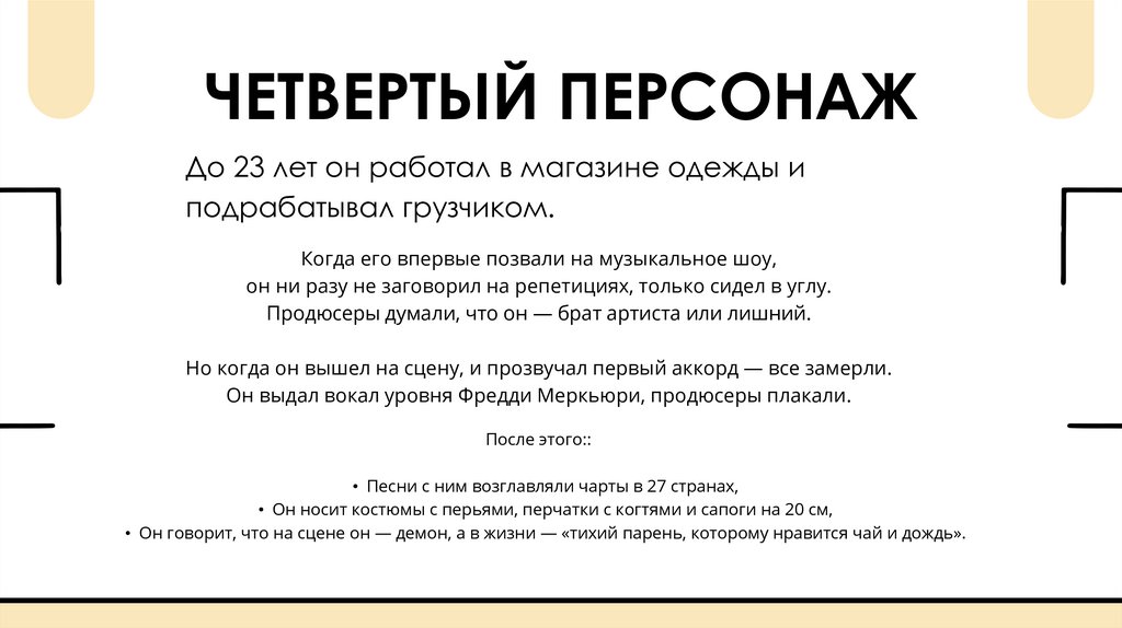 ЧЕТВЕРТЫЙ ПЕРСОНАЖДо 23 лет он работал в магазине одежды и
