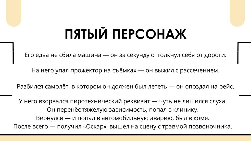 ПЯТЫЙ ПЕРСОНАЖЕго едва не сбила машина — он за секунду оттолкнул себя от дороги.