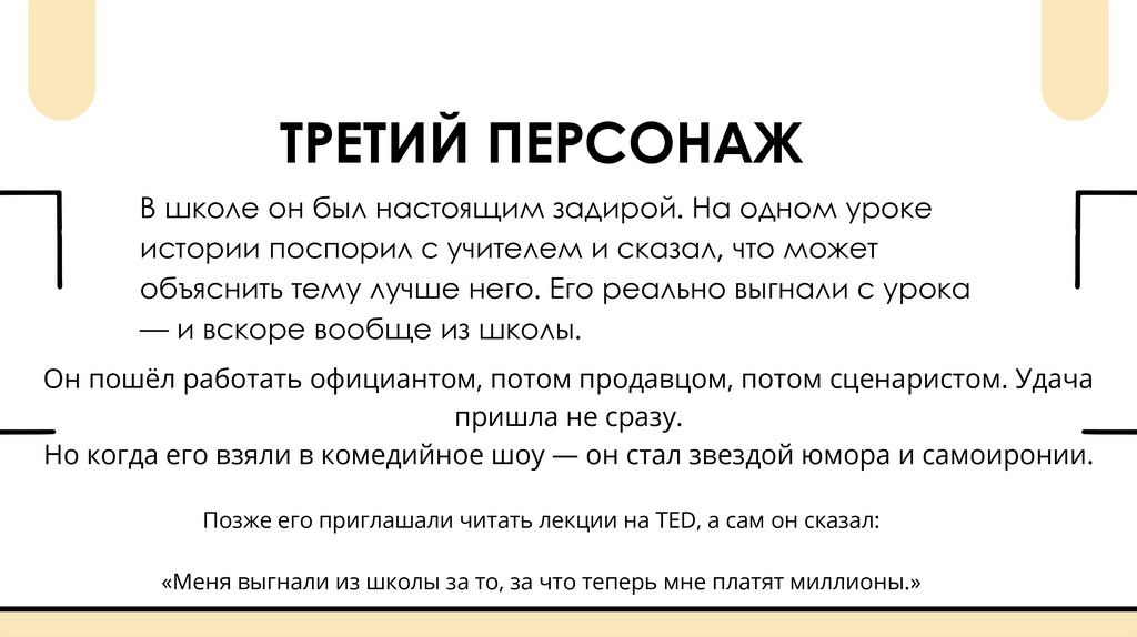 ТРЕТИЙ ПЕРСОНАЖВ школе он был настоящим задирой. На одном уроке