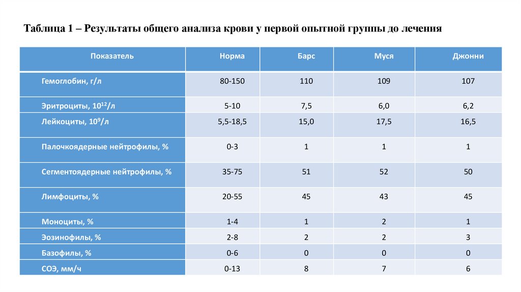 Таблица 1 – Результаты общего анализа крови у первой опытной группы до леченияПоказатель