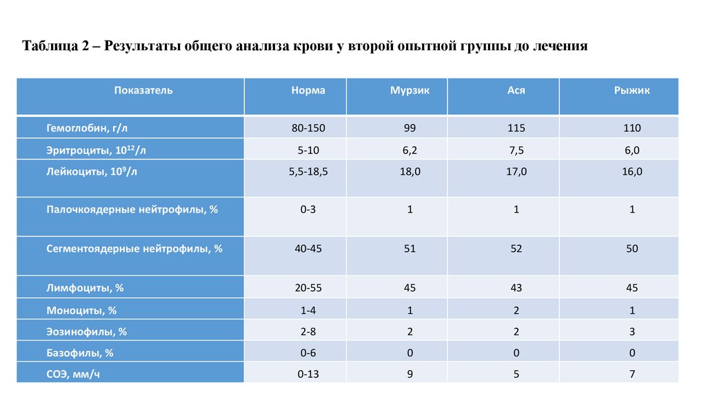 Таблица 2 – Результаты общего анализа крови у второй опытной группы до леченияПоказатель