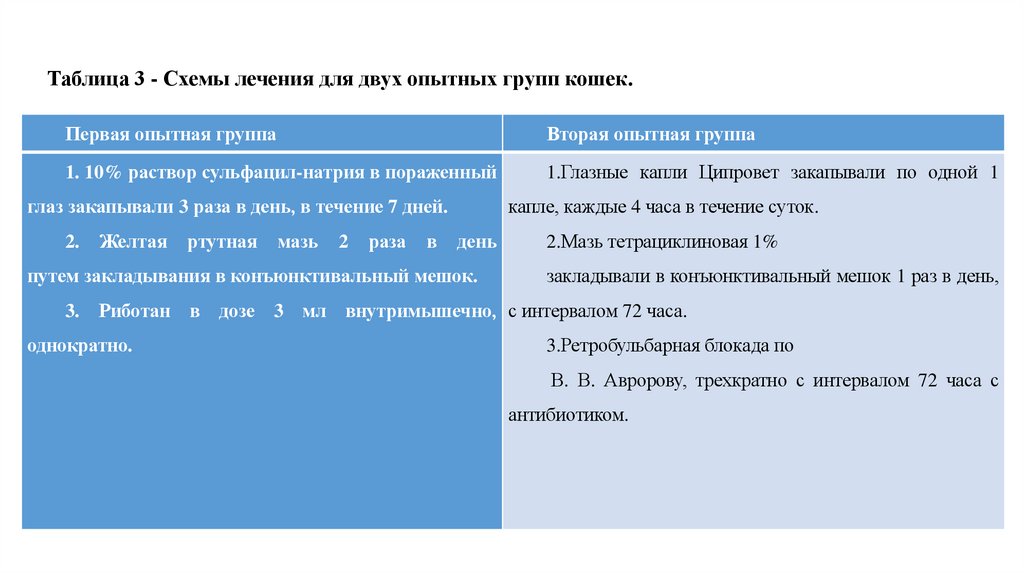 Таблица 3 - Схемы лечения для двух опытных групп кошек.Первая опытная группа