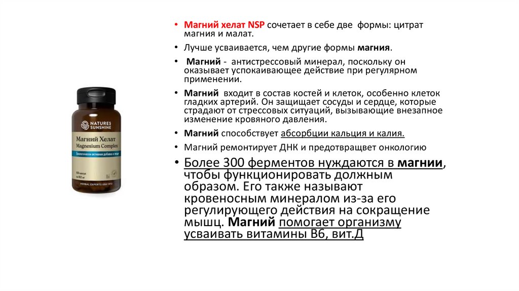 • Магний хелат NSP сочетает в себе две формы: цитратмагния и малат.