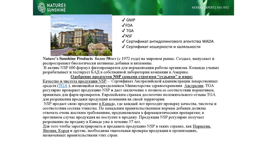 Nature’s Sunshine Products более 50лет (с 1972 года) на мировом рынке. Создает, выпускает и
