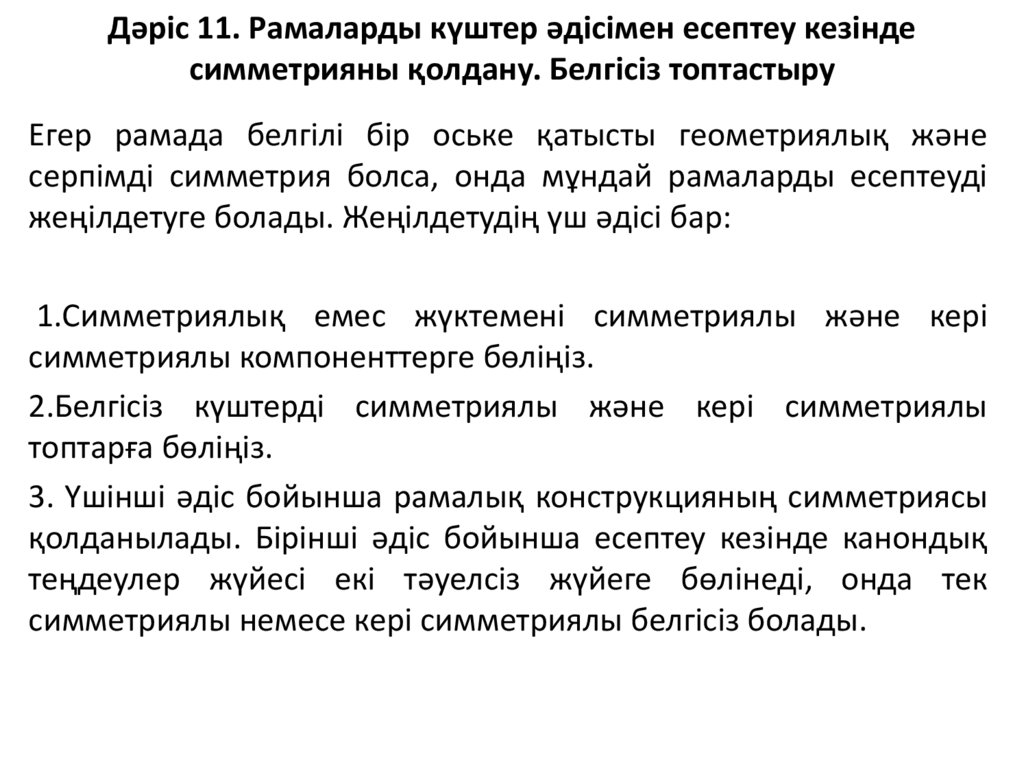 1. Дәріс 11. Рамаларды күштер әдісімен есептеу кезінде симметрияны қолдану. Белгісіз топтастыру