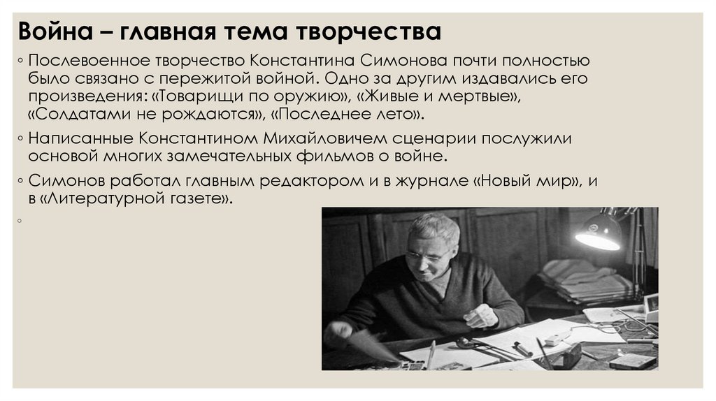 Война – главная тема творчества◦ Послевоенное творчество Константина Симонова почти полностью