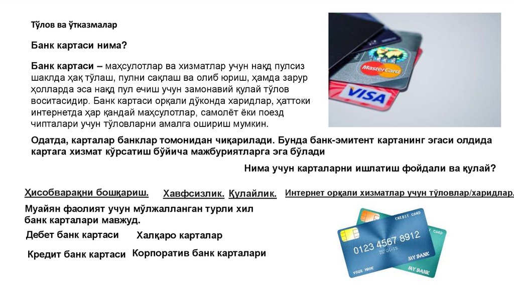 Нақд пулсиз тўловлар – банк карталар, тўлов