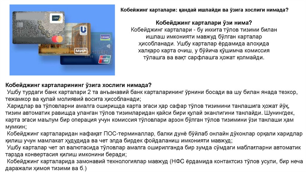 Кобейджинг карталарида замонавий технологиялар мавжуд (НФC ёрдамида контактсиз тўлов усули, бир неча