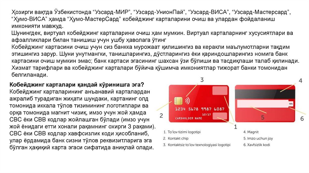 Ҳозирги вақтда Ўзбекистонда “Узcард-МИР”, “Узcард-УнионПай”, “Узcард-ВИСА”, “Узcард-Мастерcард”,“Ҳумо-ВИСА” ҳамда “Ҳумо-МастерCард” кобейджинг карталарини очиш ва улардан фойдаланиш