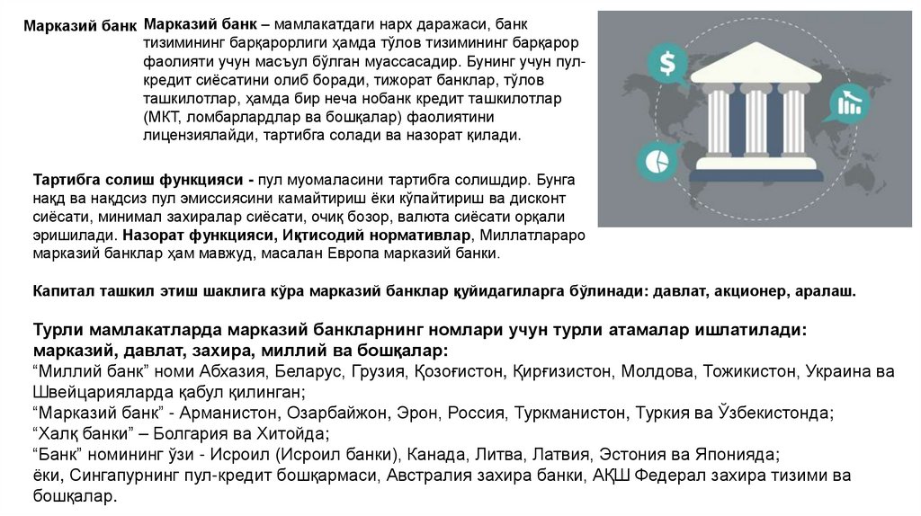 Марказий банк Марказий банк – мамлакатдаги нарх даражаси, банктизимининг барқарорлиги ҳамда тўлов тизимининг барқарор