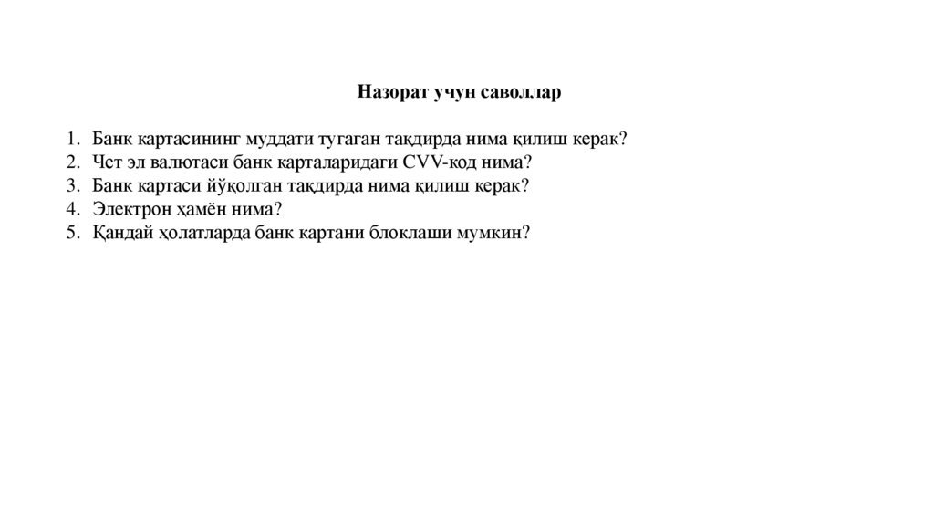 Назорат учун саволлар1. Банк картасининг муддати тугаган тақдирда нима қилиш керак?