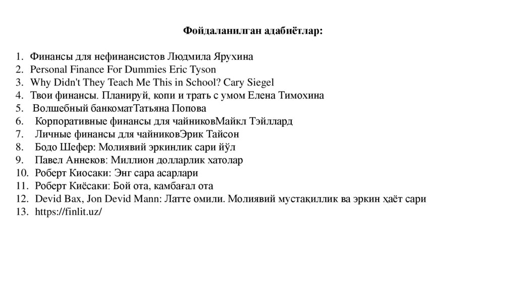 Фойдаланилган адабиётлар:1. Финансы для нефинансистов Людмила Ярухина