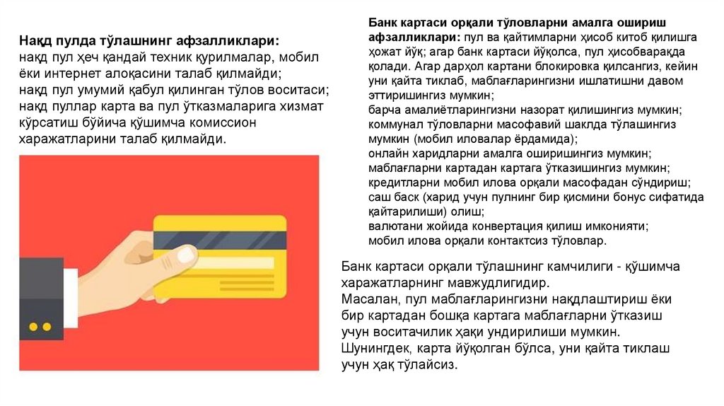 Нақд пулда тўлашнинг афзалликлари:нақд пул ҳеч қандай техник қурилмалар, мобил