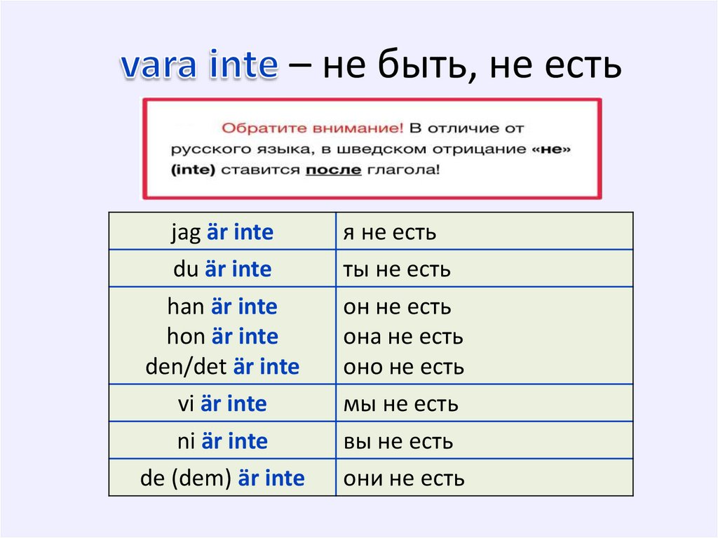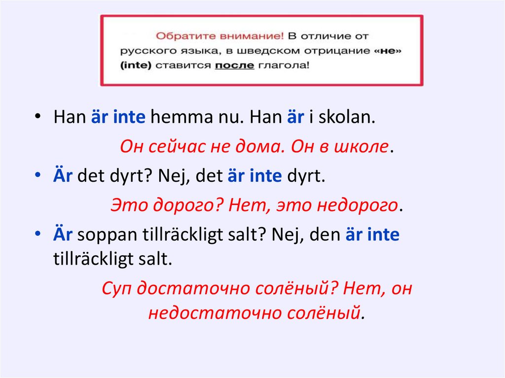 • Han är inte hemma nu. Han är i skolan.Он сейчас не дома. Он в школе.