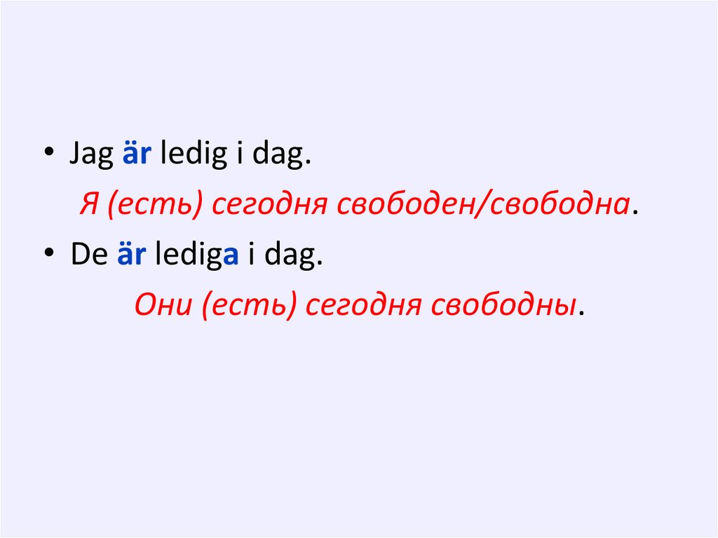 • Jag är ledig i dag.Я (есть) сегодня свободен/свободна.