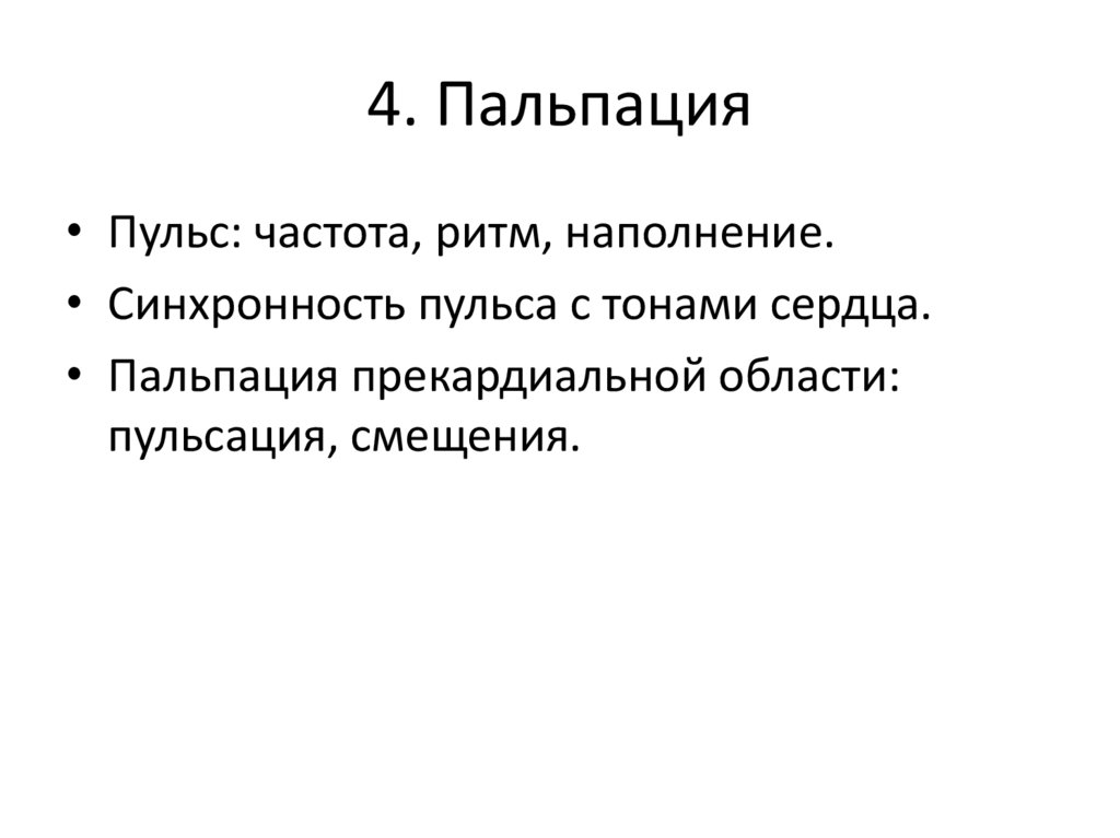 4. Пальпация• Пульс: частота, ритм, наполнение.