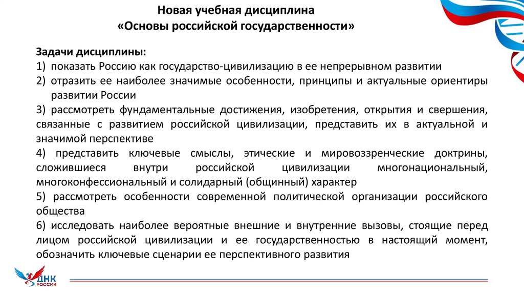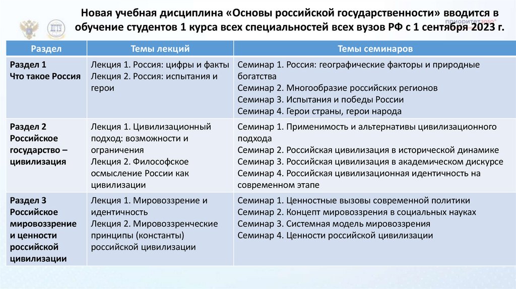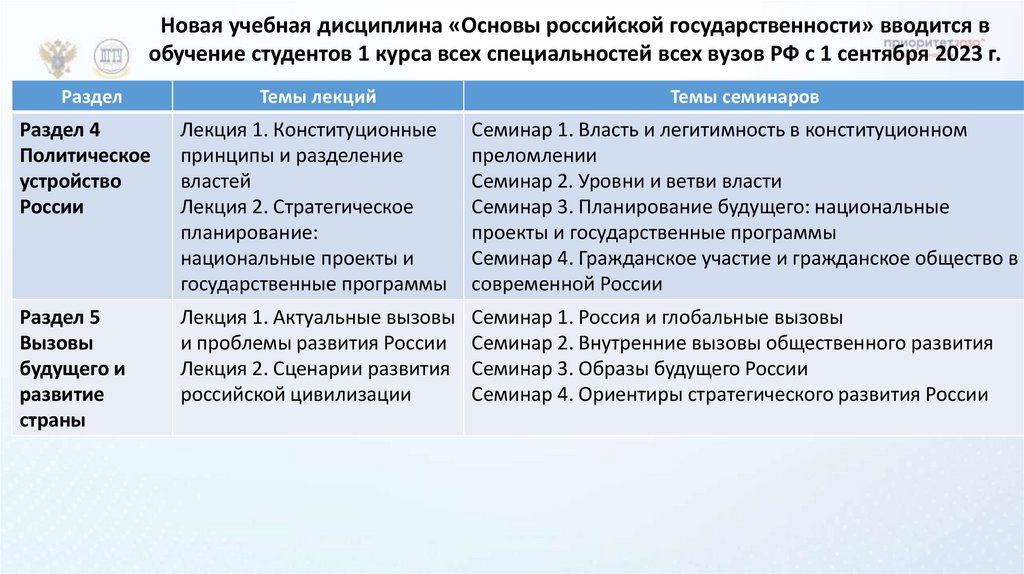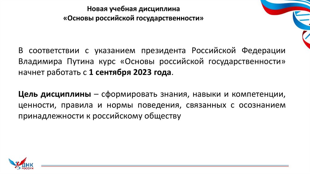 Новая учебная дисциплина «Основы российской государственности» вводится вобучение студентов 1 курса всех специальностей всех вузов РФ с 1 сентября 2023 г.