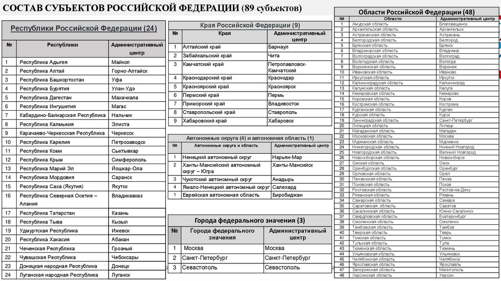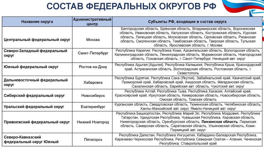СОСТАВ ФЕДЕРАЛЬНЫХ ОКРУГОВ РФНазвание округа