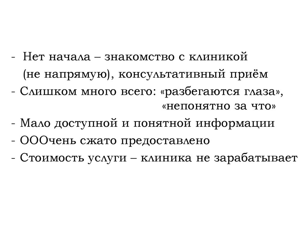 - Нет начала – знакомство с клиникой(не напрямую), консультативный приём