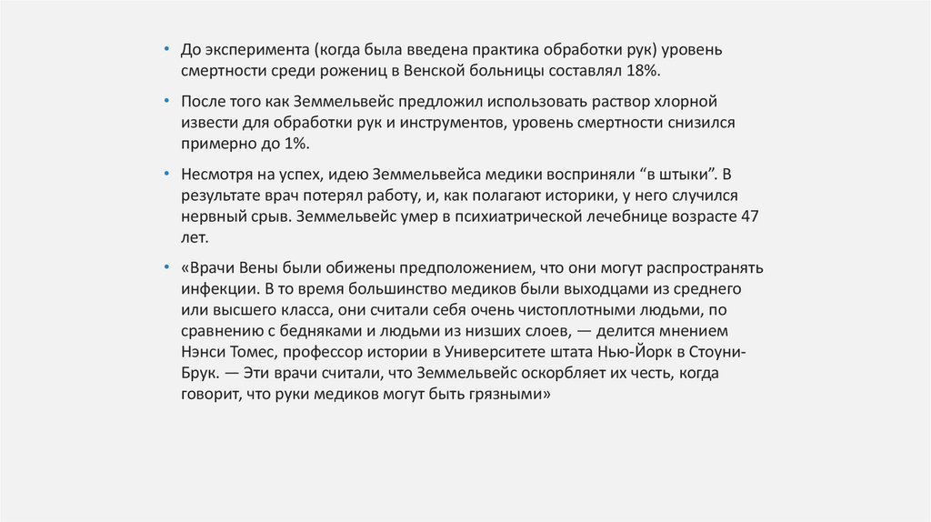 • Несмотря на успех, идею Земмельвейса медики восприняли “в штыки”. В