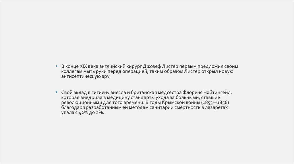 • В конце XIX века английский хирург Джозеф Листер первым предложил своимколлегам мыть руки перед операцией, таким образом Листер открыл новую