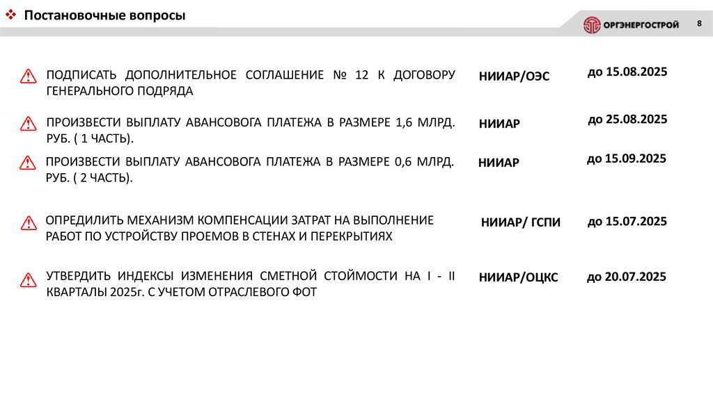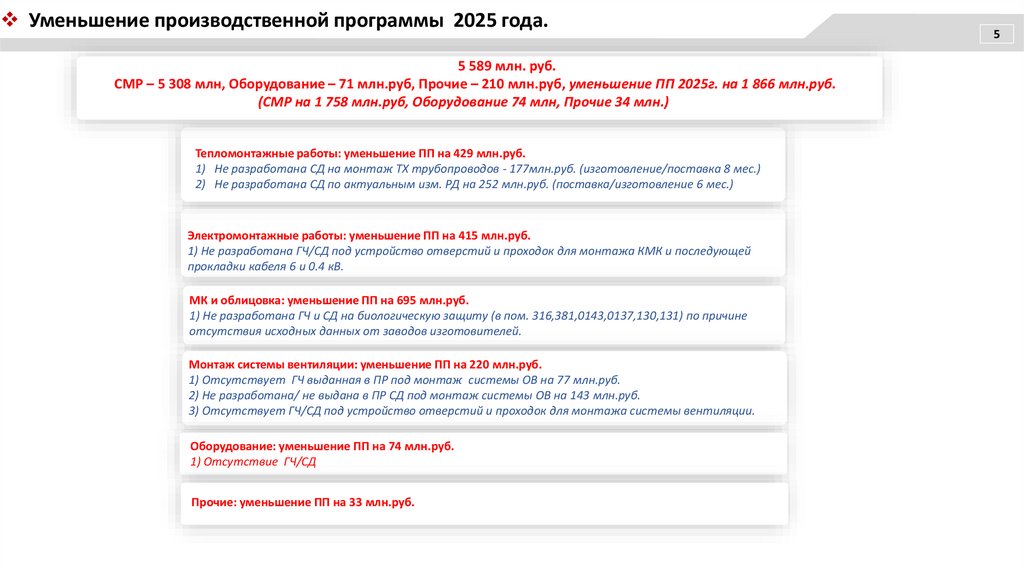 • Уменьшение ПП 2025г. Смещение «в право» работ влияющих на сроки ввода объекта в эксплуатацию