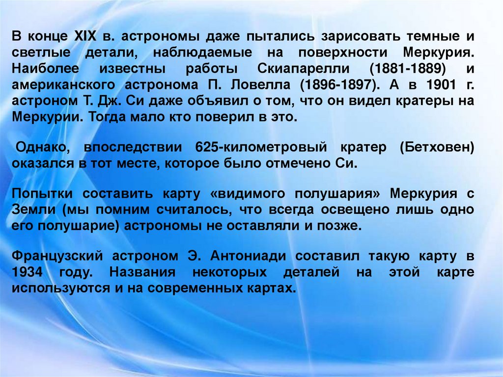 В конце XIX в. астрономы даже пытались зарисовать темные исветлые детали, наблюдаемые на поверхности Меркурия.