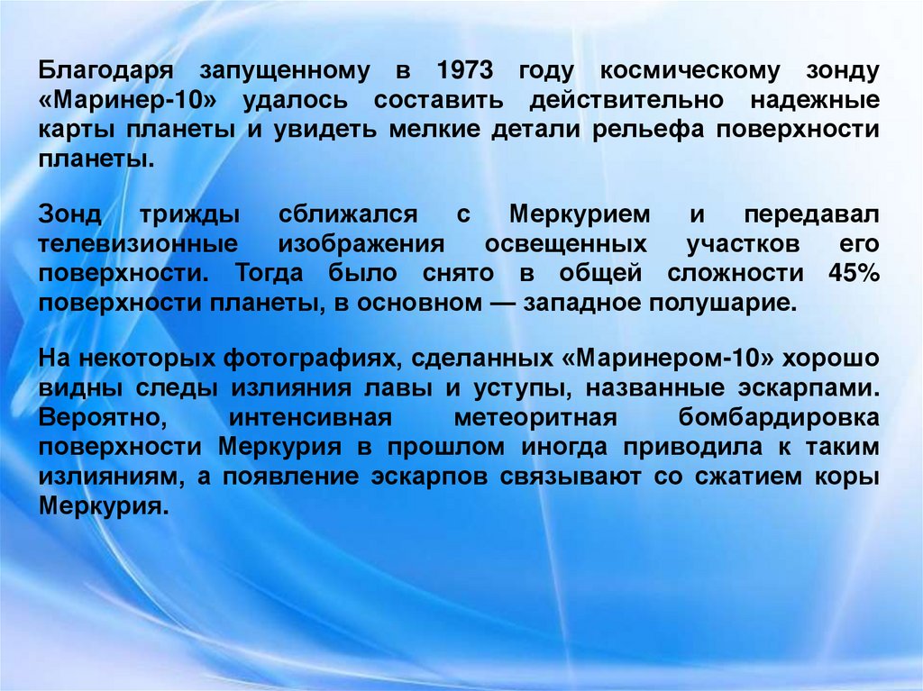 Благодаря запущенному в 1973 году космическому зонду«Маринер-10» удалось составить действительно надежные