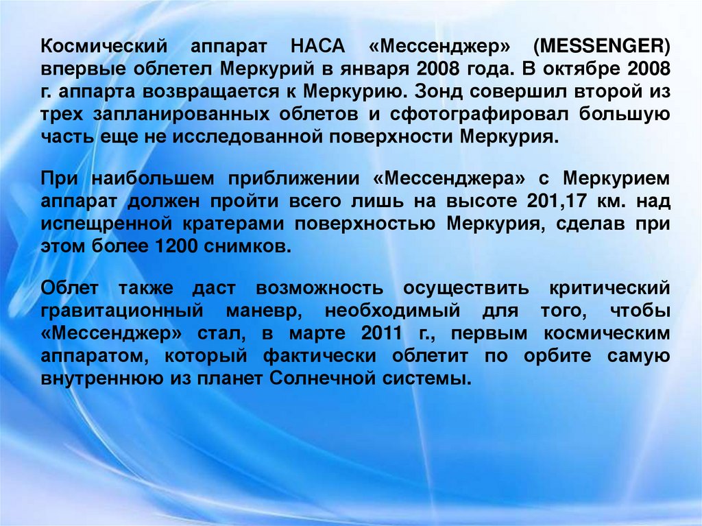 Космический аппарат НАСА «Мессенджер» (MESSENGER)впервые облетел Меркурий в января 2008 года. В октябре 2008