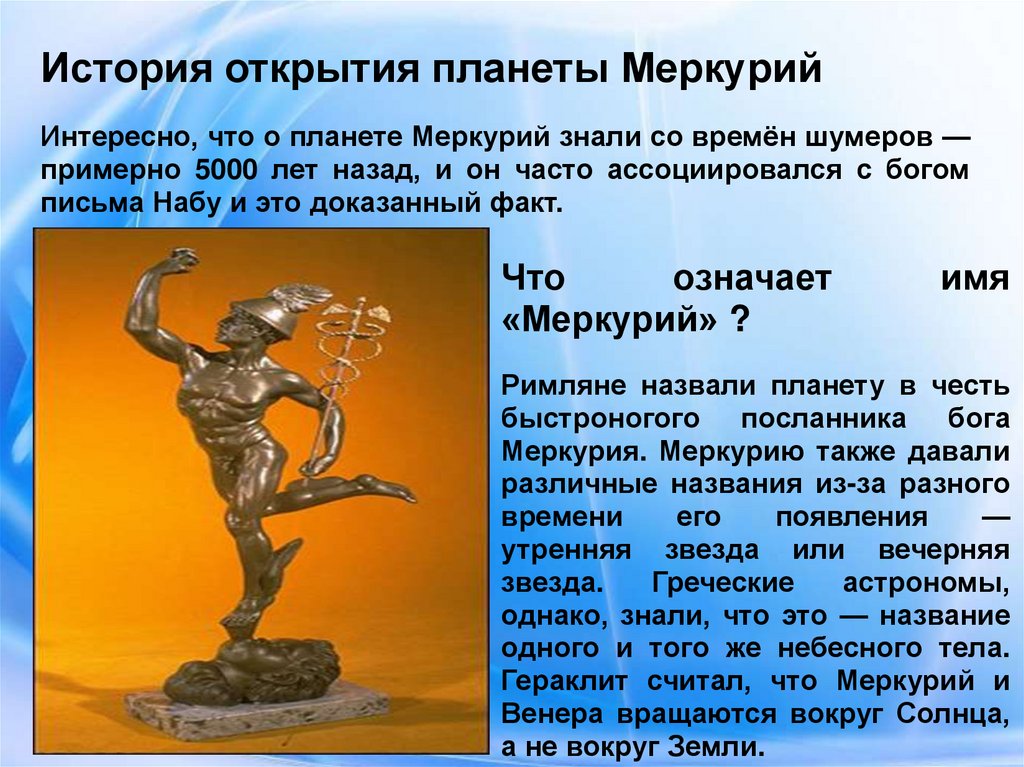 История открытия планеты МеркурийИнтересно, что о планете Меркурий знали со времён шумеров —