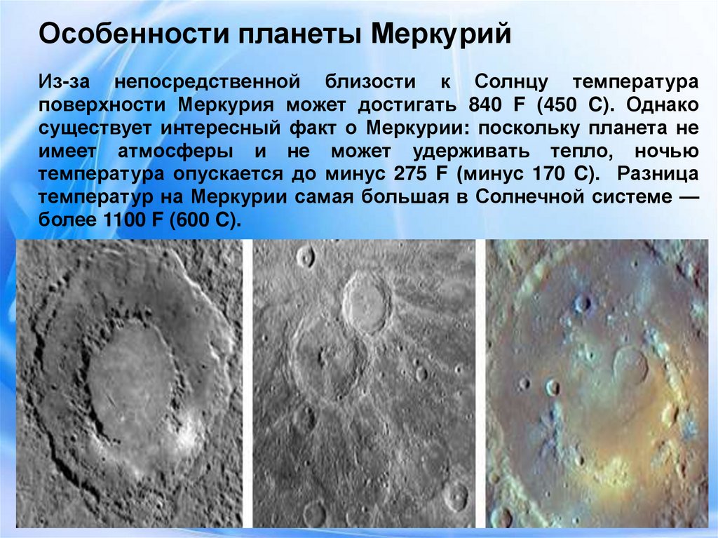 Особенности планеты МеркурийИз-за непосредственной близости к Солнцу температура