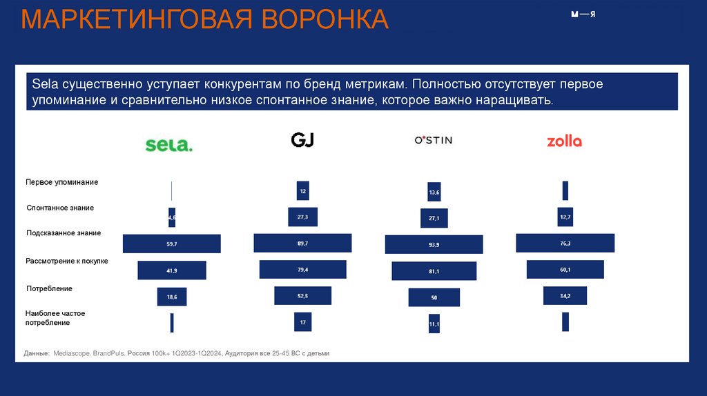 МАРКЕТИНГОВАЯ ВОРОНКАSela существенно уступает конкурентам по бренд метрикам. Полностью отсутствует первое
